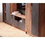 Стенка для гостиной шириной 280 см состоит из ТВ тумбы, пенала с полками и шкафа для одежды. Гостиная модульная, предметы можно менять местами или заменить на более подходящие по размерам. Мебель для гостиной Орегон выполнена в сочетании серого цвета асфальт и теплого оттенка натурального дерева дуб крафт табачный. Фасады из МДФ с фрезеровкой в виде пересекающихся линий подчеркивают современный дизайн.