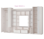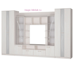 Стенка в гостиную Венеция шириной 3,4 метра в светлом оттенке дерева ясень белый. Гостиная представляет собой полный комплект мебели включающий шкафы для хранения вещей, витрины для посуды, тумбу для телевизора, открытые полки и выдвижной ящик.