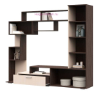 Маленькая гостиная Капри представляет собой тумбу под ТВ с пеналом и открытыми полками. Недорогая гостиная отлично впишется в небольшую комнату и решит проблему хранения книг и полезных мелочей.
