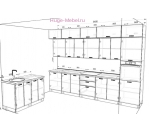 - Ширина кухни по стене: 340 см с учетом пенала, ширина острова 123 см;
