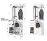 Комплект мебели в прихожую шириной 165 см состоит из вешалки и распашного шкафа для одежды. Прихожую и шкаф можно поставить рядом или по разным стенам, комплект можно дополнить комодом, пеналом или шкафом большего размера. Прихожая Руна белого цвета, высота 210 см. Напольная вешалка с зеркалом, комодом и тумбой для хранения обуви, шкаф глубиной 50 см подходит для верхней одежды и укомплектован двумя полками.