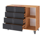 Комод 120 см с 4 выдвижными ящиками и дверцей подходит для спальни и гостиной. Комод с качественным фасадом из МДФ серого цвета и корпусом под дерево золотистого цвета отличается надежностью: ящики полного выдвижения, створка с доводчиками, высокие опоры черного цвета и оригинальные ручки. Комоды Катрин-13 длиной 120 см выпускаются в нескольких цветах и вписываются в любой интерьер.