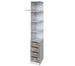 Угловое завершение для шкафов Мадрид с открытыми полками белого цвета и 4 выдвижными ящиками в светло-сером декоре ателье. Завершение для шкафа собирается на правую сторону и представляет собой угловой стеллаж.