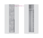 Угловой шкаф белого цвета с дверью светлого серого оттенка. Шкаф со скошенным углом и одной створкой внутри пространство которого пространство делится на отсек с полками и отсек со штангой для одежды на плечиках. Угловой шкаф без зеркал входит в серию шкафов Мадрид которые фабрика ТЭКС выпускает в нескольких размерах и цветах.