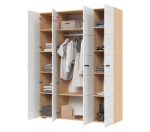 Вместительный четырехстворчатый шкаф шириной 160 см с глянцевыми белыми фасадами и корпусом в светлом оттенке дерева. Внутри шкафа за боковыми створками отсеки с четырьмя полками, за двумя центральными дверцами шкафа отделение со штангой для одежды на плечиках. Шкаф шириной 160 см без зеркал входит в серию мебели Либерти и подходит для любого помещения. Шкафы Либерти выпускаются в нескольких размерах, угловые шкафы и пеналы могут отлично сочетаться друг с другом.